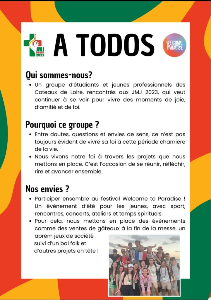 Suite aux JMJ de Lisbonne en 2023, un groupe de jeunes pro / étudiants des Coteaux de Loire s’est créé. Ils souhaitent continuer à se voir pour vivre des moments de joie, d’amitié et de foi.