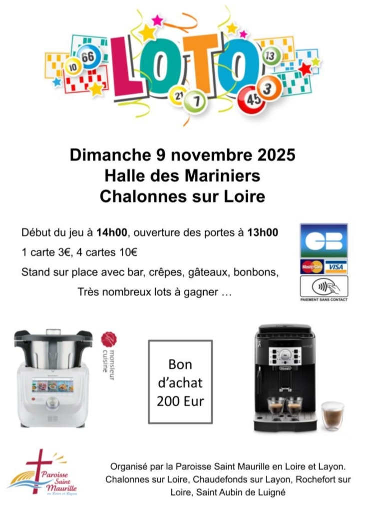 Le loto paroissial 2025 aura lieu le dimanche 9 novembre 2025 à la Halle des Mariniers à Chalonnes. Ouverture des portes à 13h00, début du jeu à 14h00.