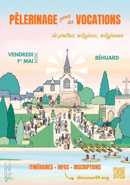 À l’invitation de notre évêque, Monseigneur Delmas, venons vivre une journée de prière pour les vocations des prêtres et des religieux et religieuses pour notre diocèse le vendredi 1er mai 2026 à Béhuard. Vous êtes invités à pèleriner pour cultiver la confiance en Dieu et le supplier de nous donner les vocations particulières dont notre diocèse a besoin.